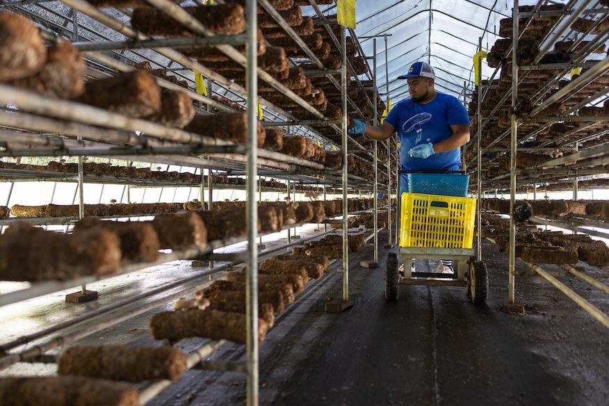 The farm currently produces roughly 5,000 pounds of shiitake mushrooms and up to 1,500 pounds of oyster mushrooms per week, depending on conditions. Cold weather can slow production, especially since the greenhouses aren’t fully insulated — an ongoing challenge during winter months.