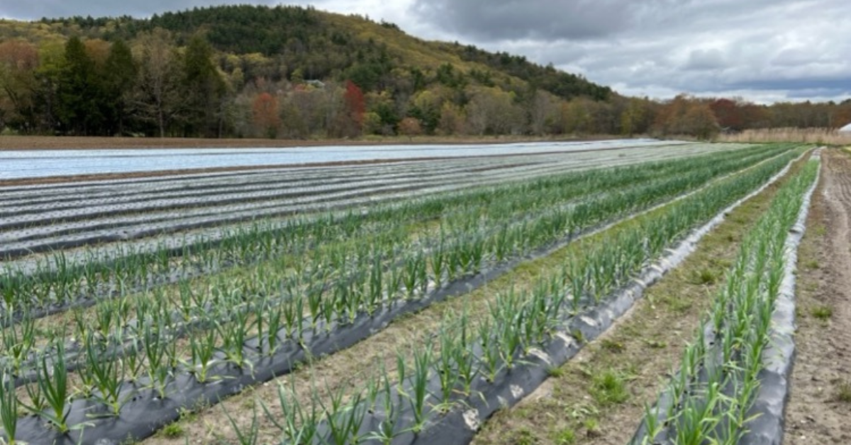 Garlic grown on soil-biodegradable plastic mulch (BDM) at Gresczyk Farms in New Hartford, Connecticut. While BDM is typically used in annual cropping systems, farmers in Connecticut are experimenting with it in overwintering crops like garlic. Photo by Shuresh Ghimire.