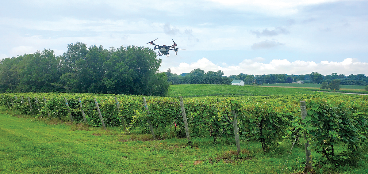University researchers and others study how drones can help growers spray in fields, orchards and vineyards. Photo courtesy of Michael Reinke.