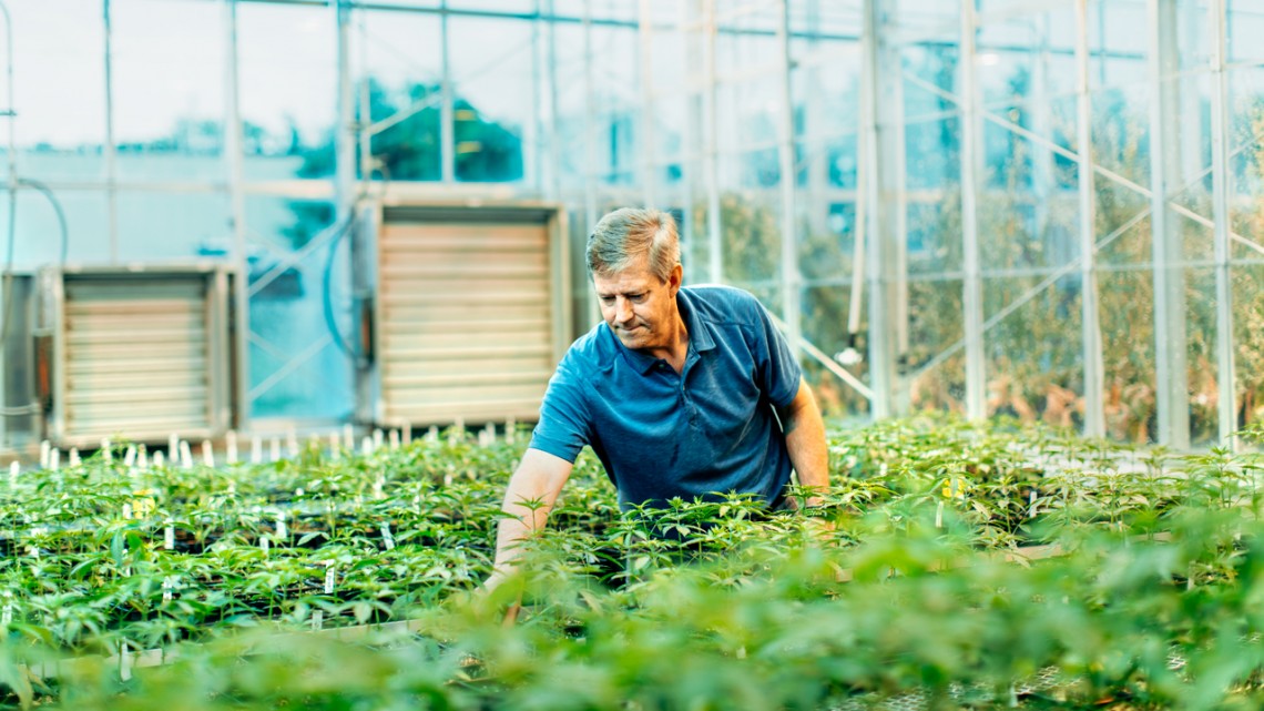 Larry Smart, professor in the Horticulture Section of the School of Integrative Plant Science, in a greenhouse examining industrial hemp. Photo: Justin Muir/Cornell University